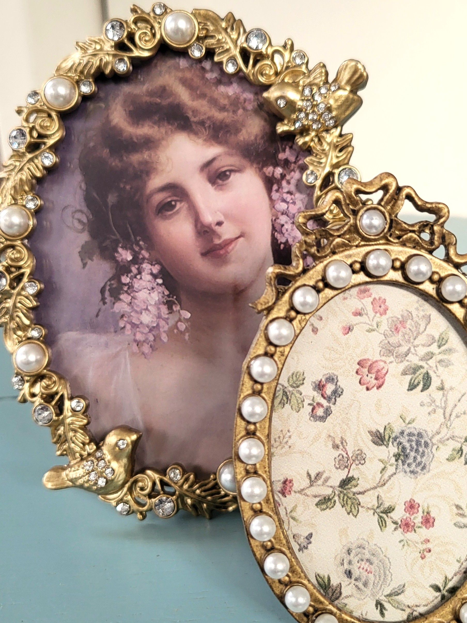 Prachtig elegant fotolijstje met op de rand parelsteentjes en boven op een strikje.