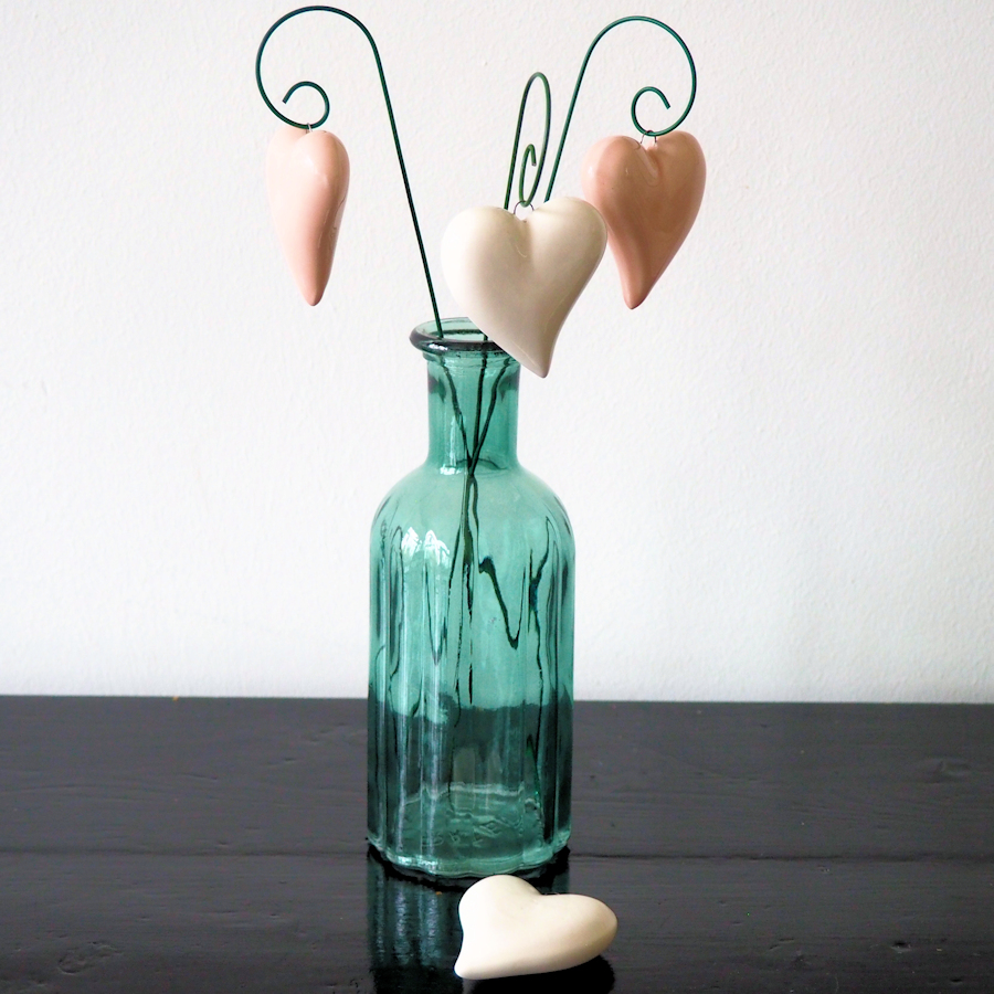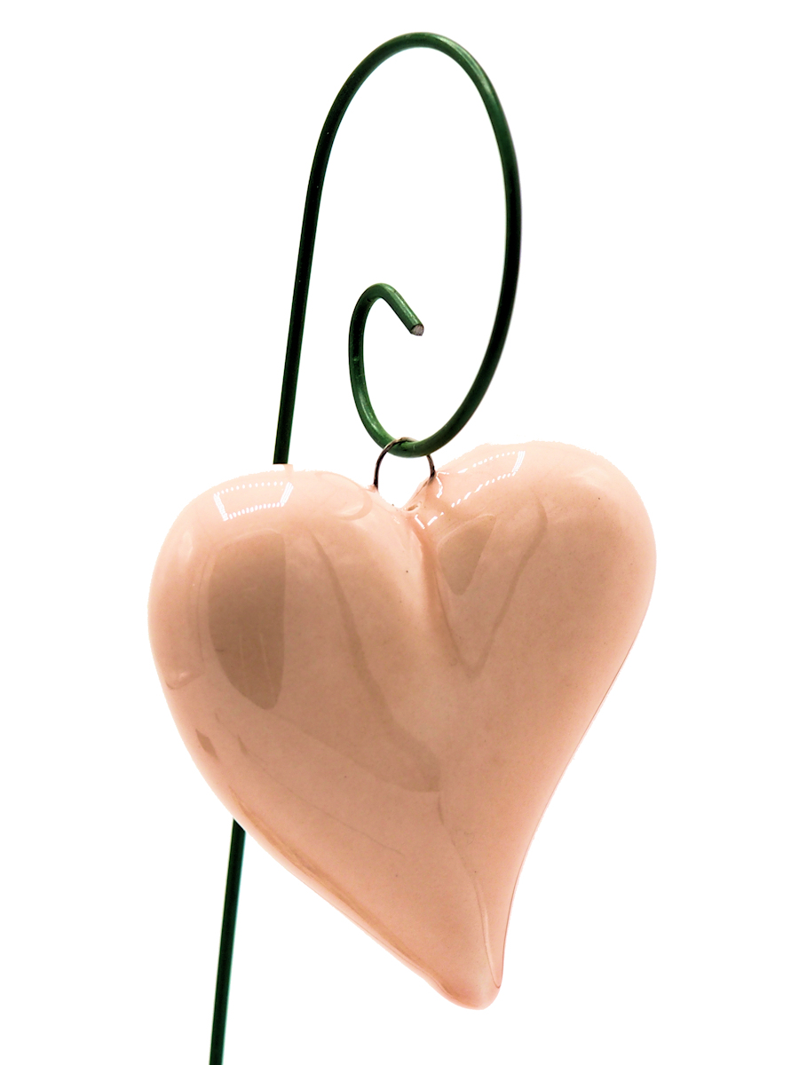 Een hartje gemaakt van keramiek. Er zit een klein oogje aan zodat het hartje kan hangen aan bijgeleverd metalen prikker. Het hartje is zowel voor binnen als voor buiten. Te verkrijgen in diverse kleuren.