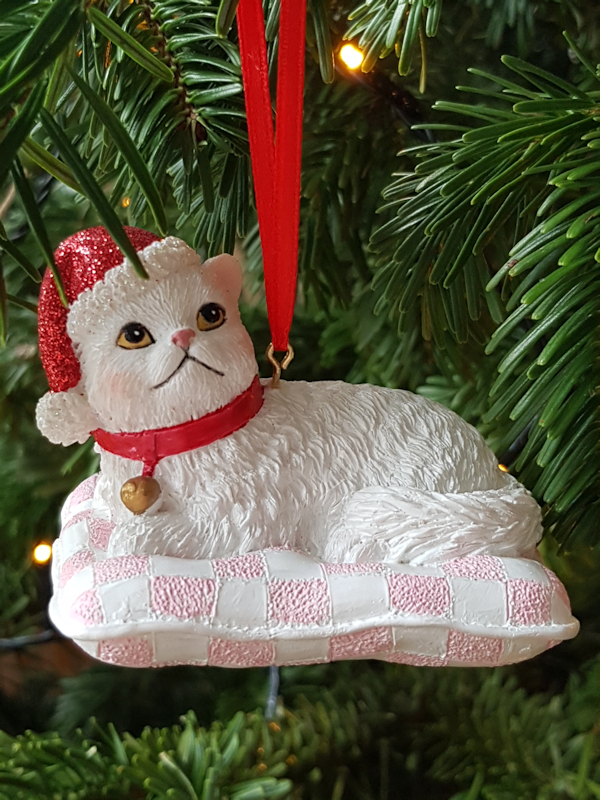 Kat rood op kussen kerstornament Materiaal: kunststof Afmeting: 6,5 x 5,5 x 7,5 cm