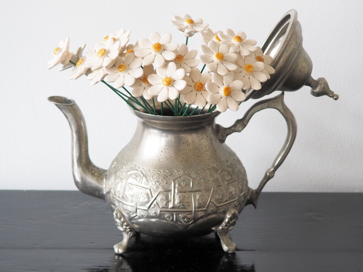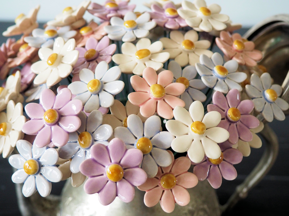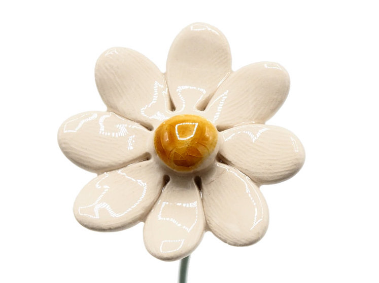 Keramieken bloem Madeliefje wit op prikker. Voor binnen en buiten.