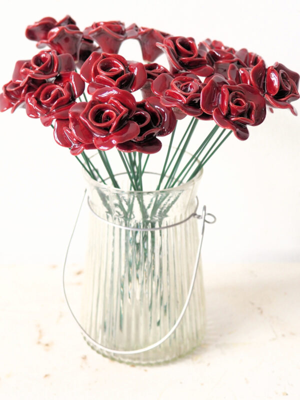 Keramische bloem Roos rood op prikker. Een mooi roosje, handgemaakt.