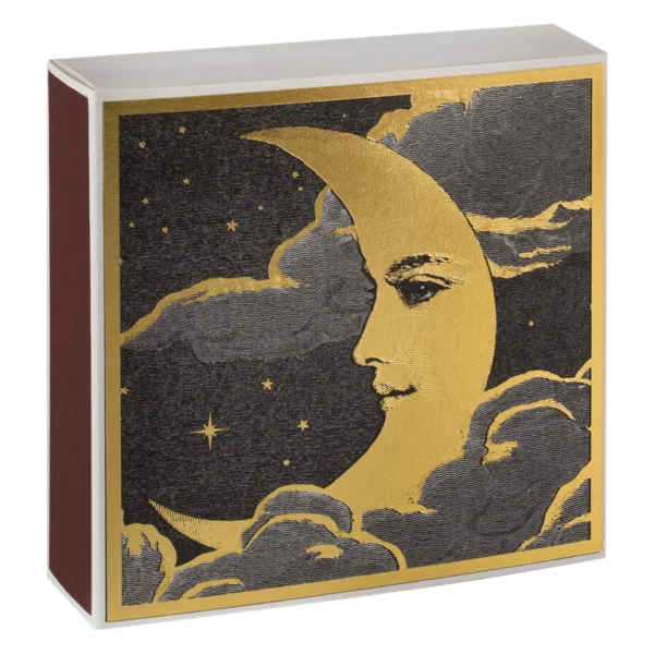 Een mooi vormgegeven lucifer doosje met een afbeelding van de maan.