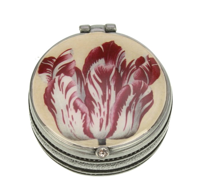 Pillendoosje met afbeelding van een papagaaientulp. Mooie kwaliteit met geëmailleerde binnenkant. Door het magneetje sluit het doosje. Aan de voorkant zit een klein glimsteentje.