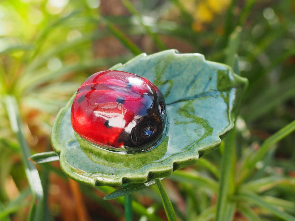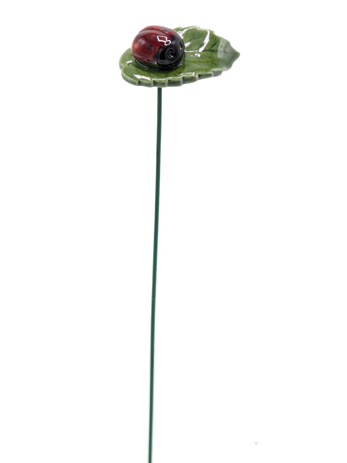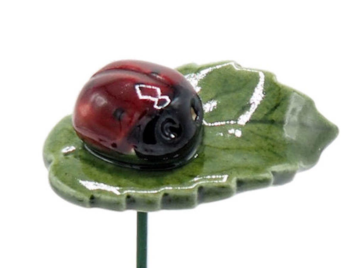 Plantenprikker Lieveheersbeestje op blad gemaakt van keramiek. De prikker is van metaal.