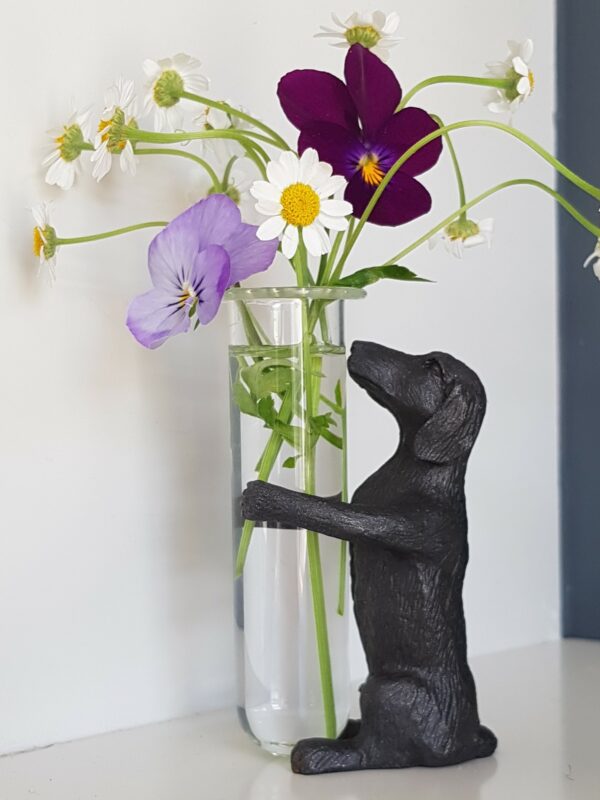 Teckel vaasje. De teckel houdt het cilindervaasje in zijn pootjes. Het formaat van het geheel is perfect om kleine bloemetjes in te zetten. Viooltjes, roosjes of andere kleine bloemetjes lenen zich hier prima voor.